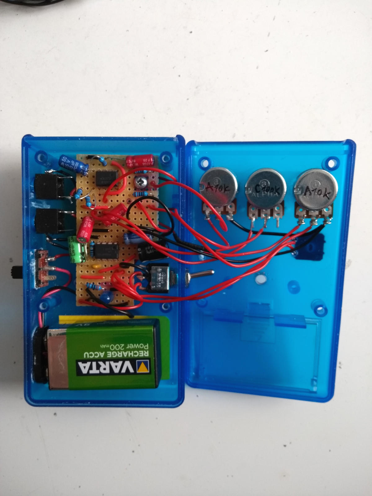 A 220 kΩ potentiometer, used as a variable resistance after the filters and before the final amplifier, allows you to "slow down" the feedback. It is another compact way to make the sound less jumpy and squeaky.