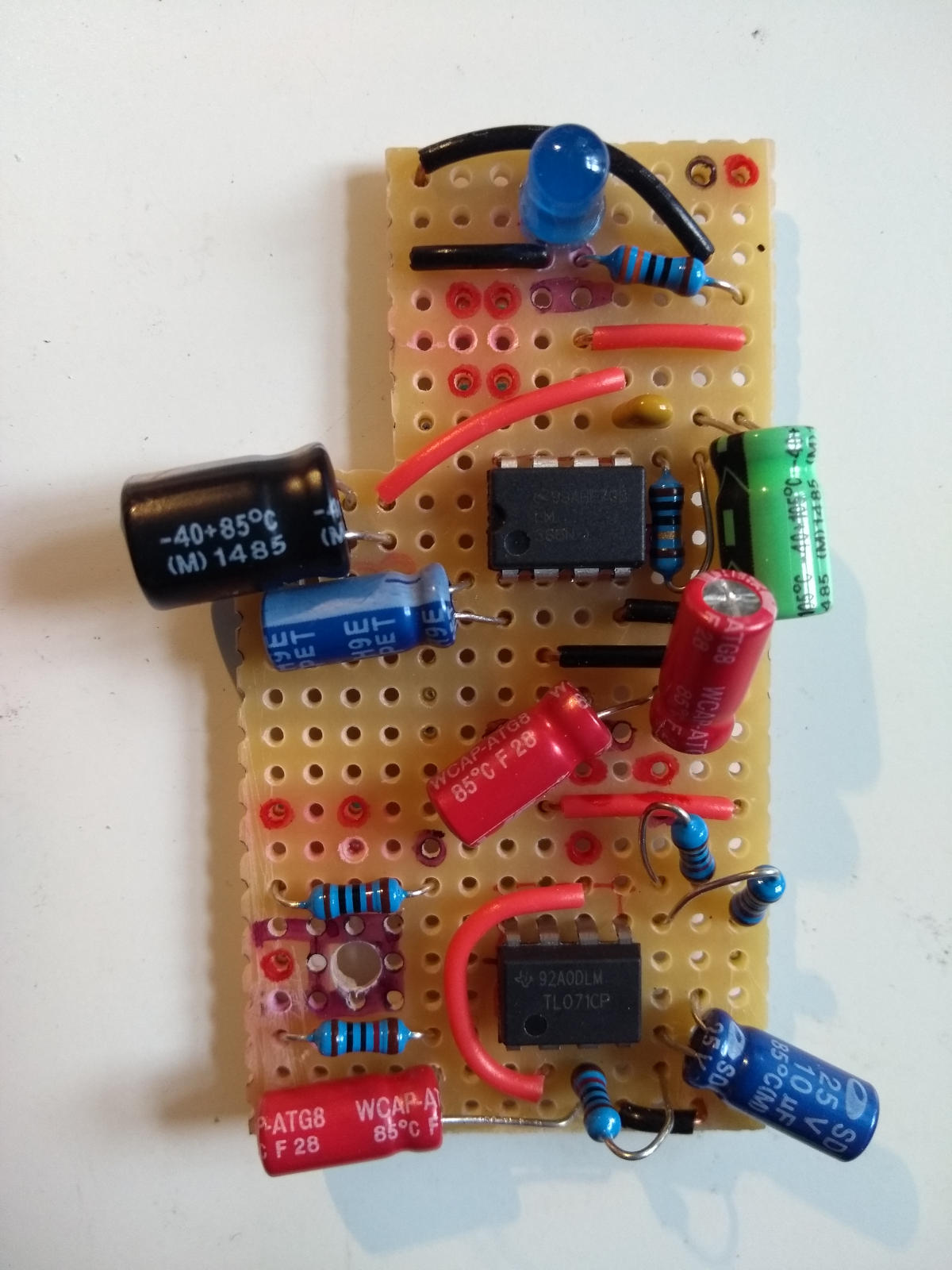 A 220 kΩ potentiometer, used as a variable resistance after the filters and before the final amplifier, allows you to "slow down" the feedback. It is another compact way to make the sound less jumpy and squeaky.