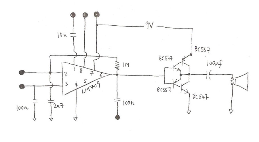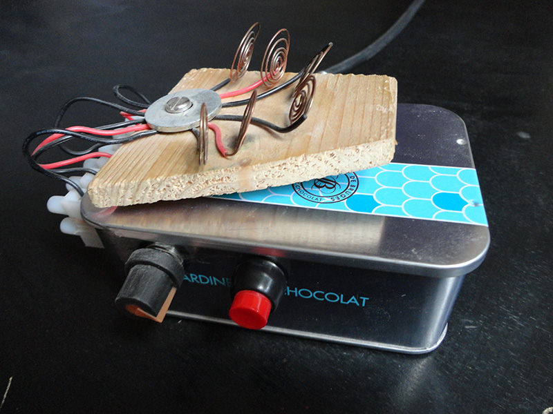 (1) The crackle box is a circuit designed by Michel Waisvisz in 1974 at STEIM. It basically consists of an operational amplifier (LM709) whose connections are brought on the control surface, and left open. The user, touching them, activates the circuit using the body as conductor. The sounds produced are related to the resistance of the body, and the amount of pressure applied on the connectors.